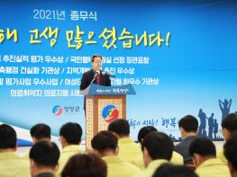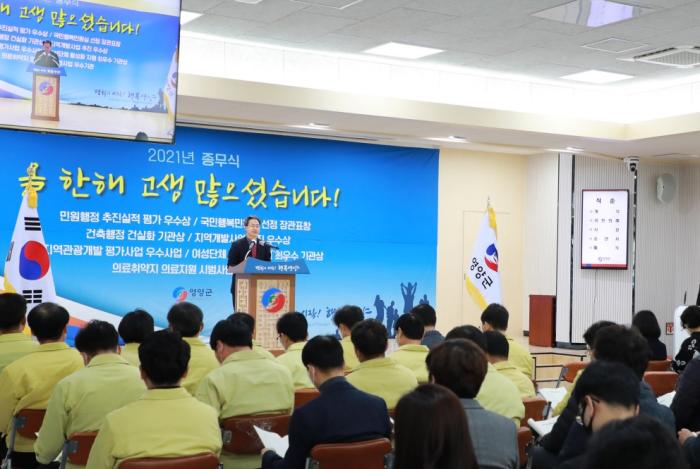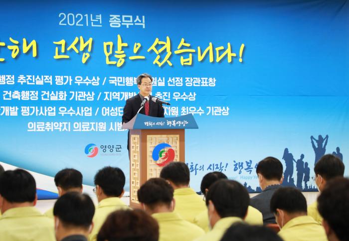 오도창 영양군수는 12월 31일 군청 대회의실에서 개최된 종무식에서 “2021년 어려운 여건 속에서도 군정과 함께 해주신 군민 여러분께 감사드리며, 새해는 더 큰 꿈과 새 희망을 그려나갈 것을 약속드린다.”고 소회를 밝혔다.