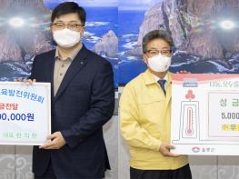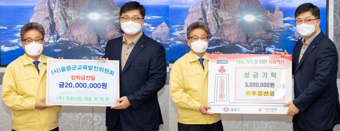 2021년에 이어 2022년에도 ㈜우정산업이 (사)울릉군교육발전위원회에 지역인재양성을 위한 기탁금의 첫 스타트를 끊었다.
