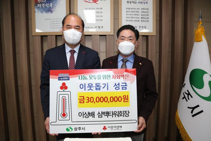 삼백타워&칸나에스엔에스(대표 이상배)는 2022년 임인년 새해를 맞이하며 1월 5일 상주시 관내 저소득 취약계층을 위한 이웃돕기 성금 3,000만원을 기탁하며 ‘희망2022 나눔캠페인’의 사랑의 온도를 높였다.