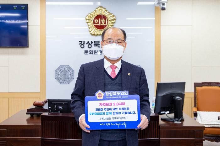 (경북도의회=경북온뉴스) 김승진 기자 = 경상북도의회 박판수 의원은 3월 10일에 자치분권 2.0시대 개막을 응원하기 위해 ‘자치분권 기대해 챌린지’에 동참했다.