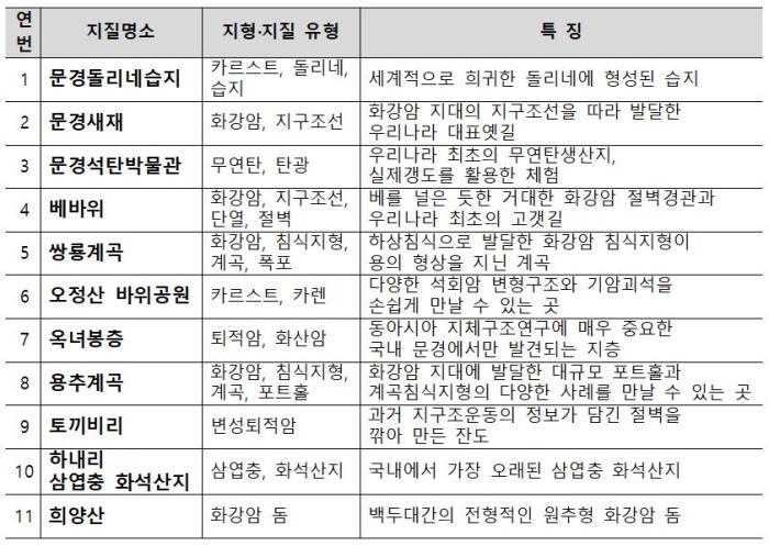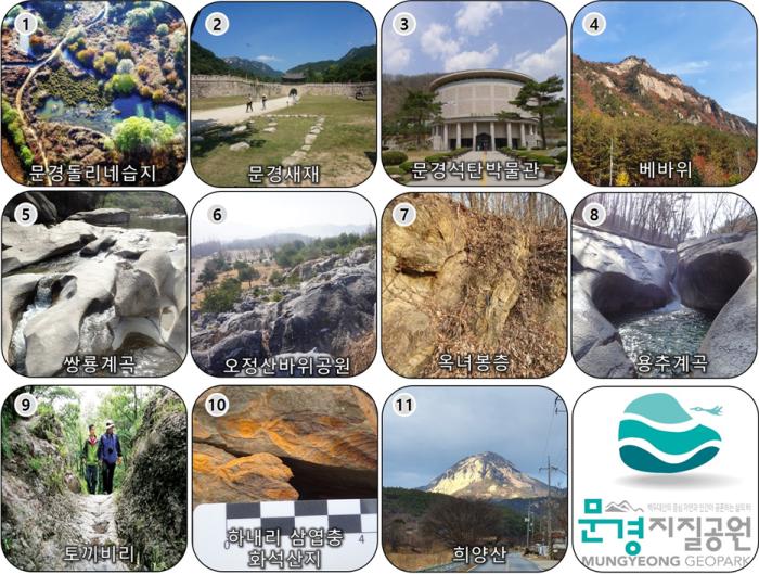 문경 국가지질공원 인증후보지는 문경시 행정구역 전체를 대상으로 하며, 911.95㎢의 면적과 돌리네습지, 석탄박물관(은성탄광 석탄채굴지), 베바위 등 총 11개의 지질명소를 포함한다.