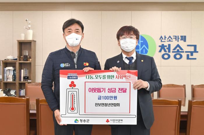청송군 진보면청년연합회(회장 권재성)가 지난 1월 21일 이웃돕기 성금 1백만원을 청송군에 전달하여 ‘희망 2022 나눔캠페인’에 동참했다.