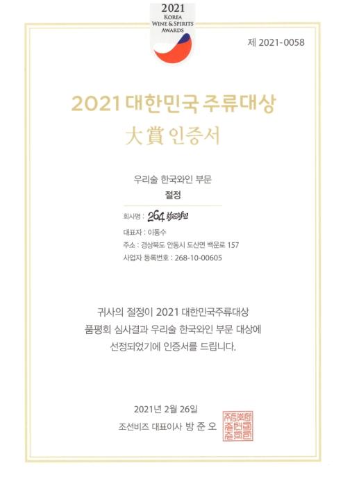(안동시=경북온뉴스) 김승진 기자 = 264청포도 와이너리에서 생산한 와인 ‘절정(13.5%)’ 제품이 ‘2021 대한민국 주류 대상’ 우리 술(한국 와인) 부문에서 대상을 수상했다.