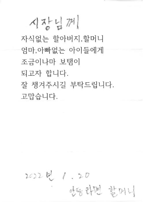 자신을 ‘안동라면할머니’라고 밝힌 편지에는 "시장님께. 자식 없는 할아버지 할머니, 엄마 아빠 없는 아이들에게 조금이나마 보탬이 되고자 합니다. 잘 챙겨주시길 부탁드립니다. 고맙습니다. 2022년 1월 20일 안동라면할머니"라고 적었다.