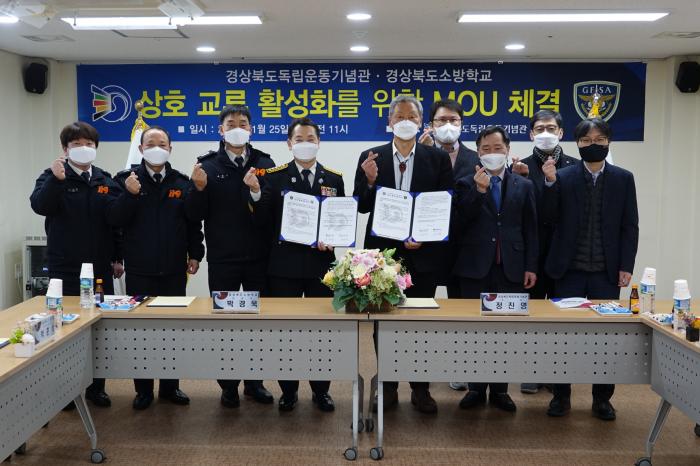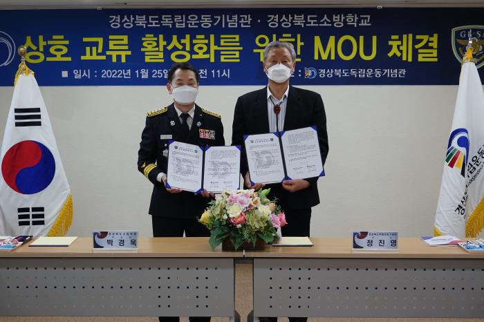경상북도독립운동기념관(관장 정진영)과 경상북도소방학교(학교장 박경욱)는 소방공무원들에게 경북의 독립운동사를 바르게 알리고, 자긍심과 사명감을 높여 줄 수 있는 교육 연수 활성화를 위하여 2022. 1. 25.(화) 업무협약을 체결했다.