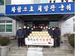 코로나19로 사회적 분위기가 어수선하지만 설날을 맞아 장수어르신에게 즐거운 설 명절을 보내시라고 임원들이 직접 장수노인들에게 전달했다.