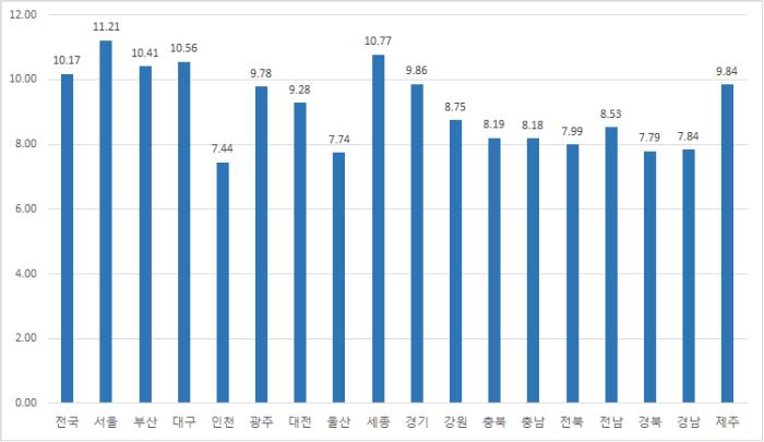 시․도 상승 순위 중 서울(11.21%), 세종(10.77%), 대구(10.56%), 부산(10.41%) 등에 이어 15번째이다.