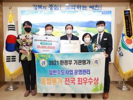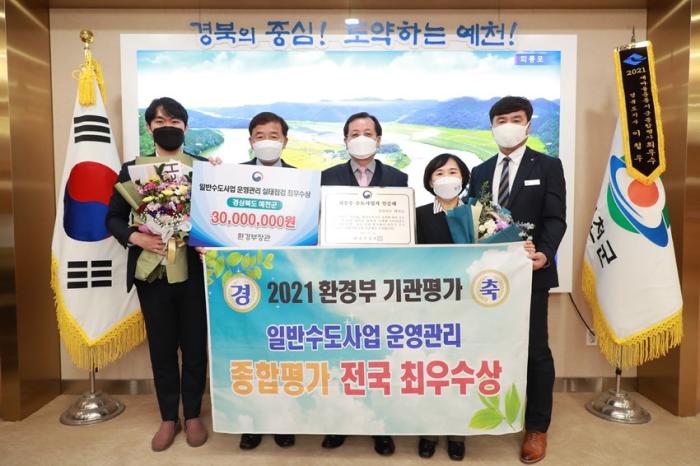 예천군이 지난해 연말 환경부에서 주관한 ‘2021년 일반수도사업 운영‧관리 실태 평가’에서 전국 161개 수도사업자 중 5만명 미만 47개 군부 중 전국 ‘최우수’ 기관으로 선정돼 인증패와 포상금 3천만 원을 받고 축하. 기념촬영 모습