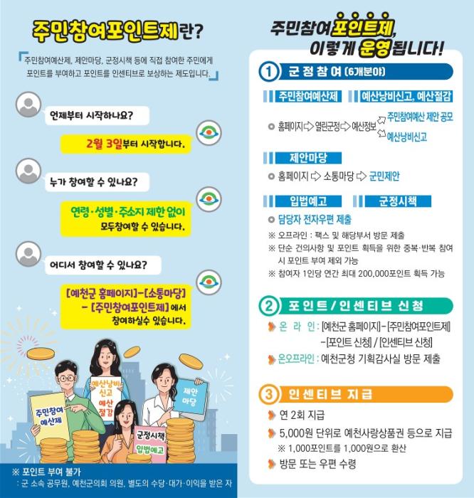예천군은 올해 처음으로 주민들의 군정참여 기회 확대를 위해 2월 3일부터 ‘주민참여 포인트제’를 시행한다.