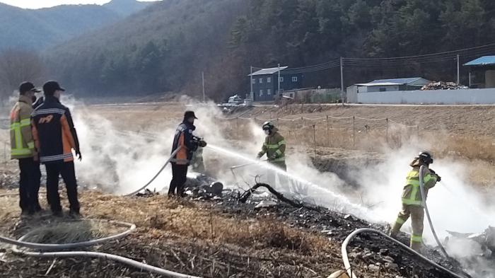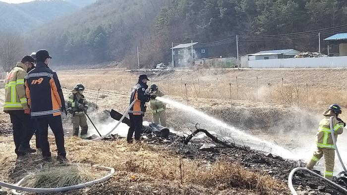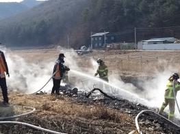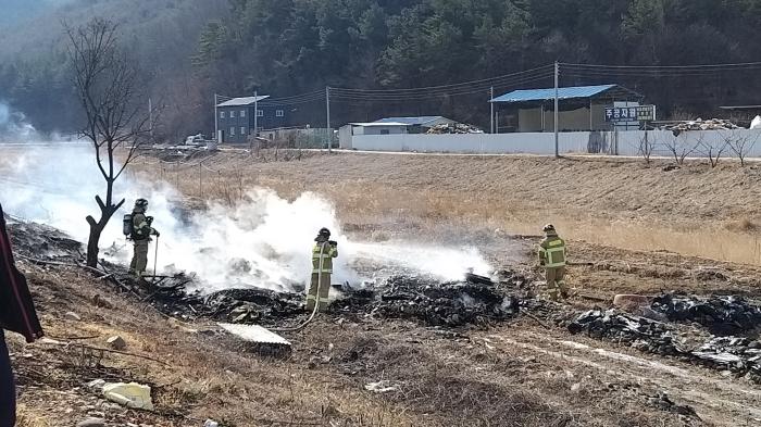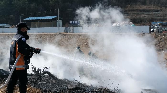 설날 연휴인 30(일) 오후12시경 안동시 남선면 소재 쓰레기 집화장에 주민의 부주의로 추정되는 화재가 발생 인근 산으로 번질 위기에 다행히 주민신고로 긴급 출동한 안동119에 의해 진화되는 모습(사진/김승진 기자)