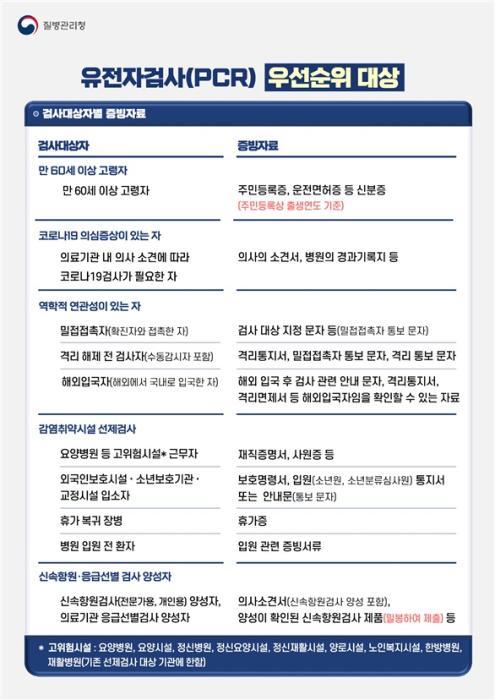 고위험군으로 분류된 60세 이상 고령자, 의사유소견자, 역학적 연관자, 자가검사키트 양성자 및 감염취약시설 관련자 등은 기존과 같이 보건소 내 마련된 선별검사소에서 PCR 검사를 받는다.