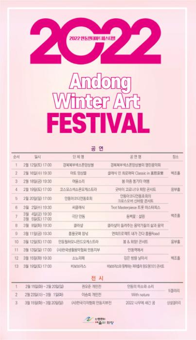 ‘2022년 안동윈터아트페스티벌’개최를 위해, 지난해 12월 지역 민간예술단체를 대상으로 참여 희망 단체를 모집 공고하여 외부 전문가의 엄격한 심사를 실시했다. 공연 분야는 비보 브라스 외 12개의 단체(연극, 클래식, 전통예술, 대중, 복합 등)가 선정됐다. 전시 분야는 작가 권오준, 이승희의 개인전과 (사)한국각자협회 안동지부전이 선정되어 개최될 예정이다.