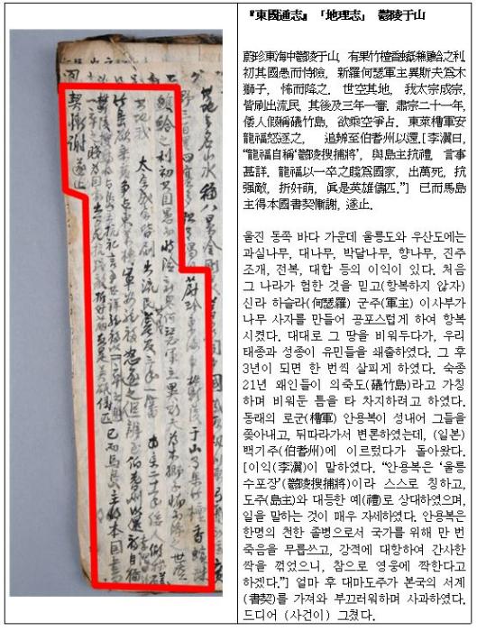 하지만 그 주장과 다르게 예천 지역 유학자가 1868년 편찬한 백과사전류의「동국통지(東國通志)」에는 조선 숙종 때 인물인 안용복이 울릉도·독도 영토문제를 해결한 사건 전말이 기록되어 있다.