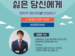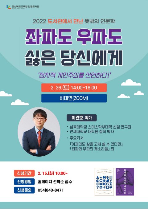 경상북도교육청 안동도서관(관장 마원숙)은 2월 26일(토) 오후 2시, 비대면 플랫폼(ZOOM)으로 인문학 강연 ‘좌파도 우파도 싫은 당신에게’를 운영한다.