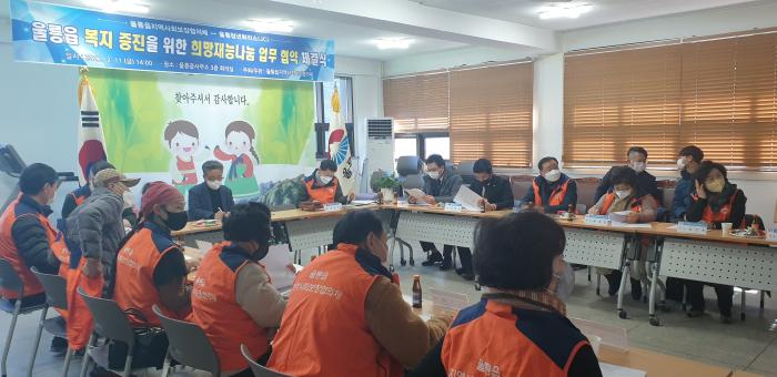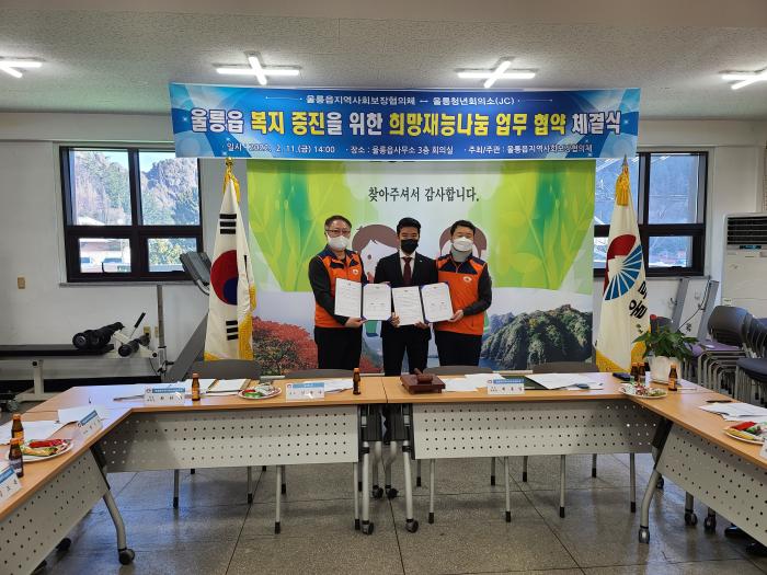 회의 시작에 앞서 울릉읍 지역사회보장 협의체 최하규, 최동일 공동위원장은 울릉읍 지역사회보장 협의체 ↔ 울릉 청년회의소(JC)와 “희망 재능 나눔” 업무협약을 체결했다.