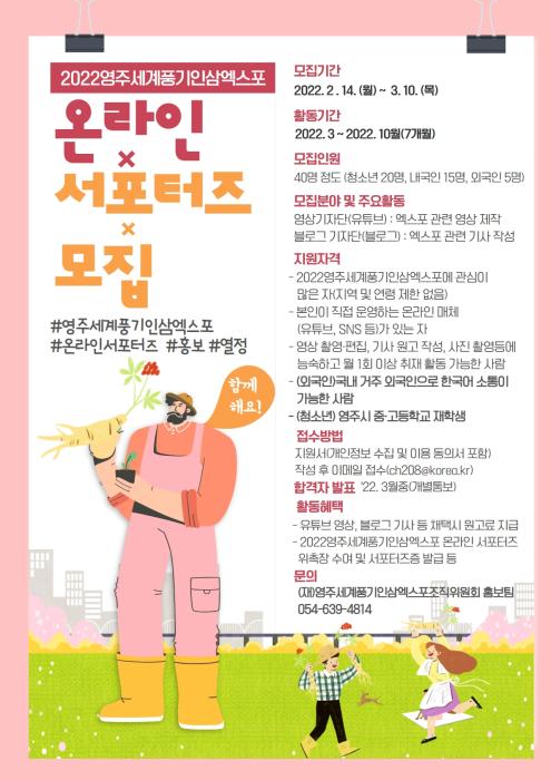 온라인 서포터즈 모집에 관한 자세한 사항은 엑스포 홈페이지를 통해 확인할 수 있으며, 기타 문의는 영주시 엑스포기획단(☎ 054-639-4814)으로 하면 된다.