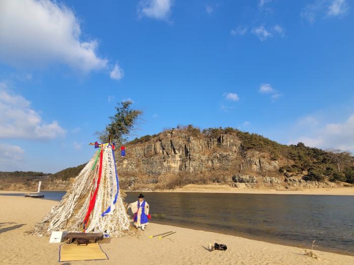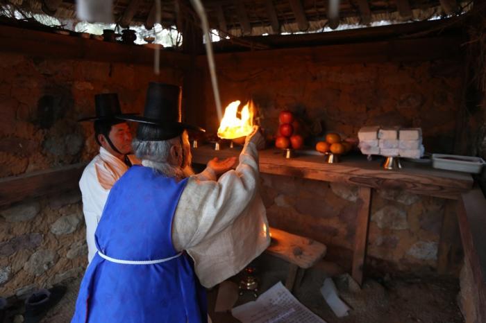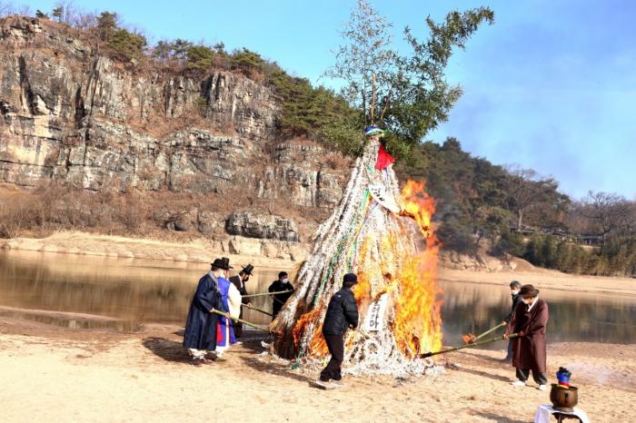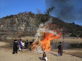 [화보] 임인년 첫 정월대보름을 맞아 2월15일 오전 6시 하회마을 화산 중턱의 서낭당, 국신당, 삼신당 일원에서 동제가 열렸다. 이날, 9시 부용대 앞 강변에서는 소수의 마을 주민만이 참여하여 소원지 달집태우기 행사도 열렸다.