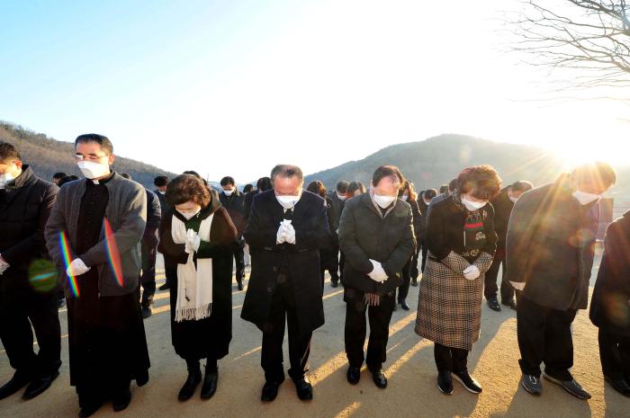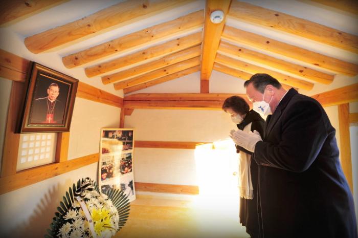 이날 참석자들은 코로나19 사회적 거리두기를 준수한 가운데 헌화와 묵념을 하며 추기경 선종 13주기를 기렸다.