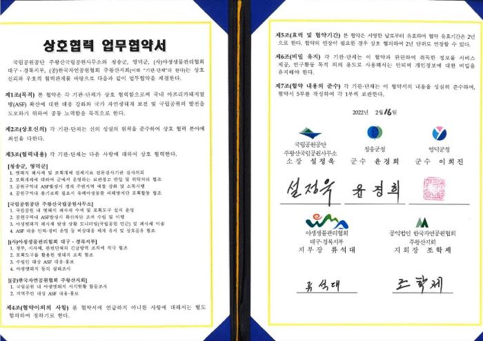 국립공원공단 주왕산국립공원사무소는 지난 16일 최근 아프리카돼지열병(ASF)의 경북지역 유입에 따라 주왕산국립공원으로의 확산을 사전에 방지하기 위해 청송군, 영덕군 등 유관기관·단체와 아프리카돼지열병 공동 대응을 위한 업무협약을 체결했다.