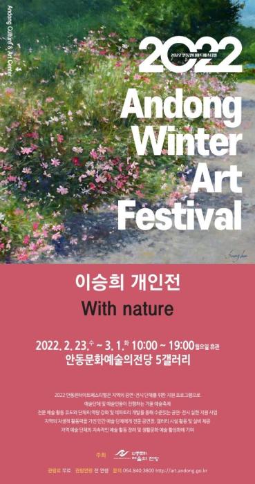 '2022년 안동윈터아트페스티벌AWAF(Andong Winter Art Festival)' 두 번째 전시회가 2월 23일부터 3월 1일까지 6일간 안동문화예술의전당 5갤러리에서 이승희 작가의 'With nature' 개인전으로 열린다.