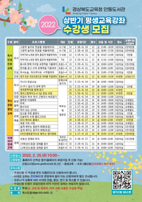 경상북도교육청 안동도서관은 독서·인성·진로교육, 정신문화함양교육, 미래리더경제교육 3개 분야 25개 평생교육 프로그램을 개설하여 오는 25일부터 수강생을 모집한다.
