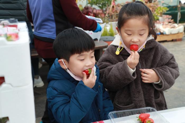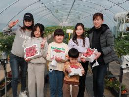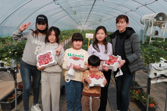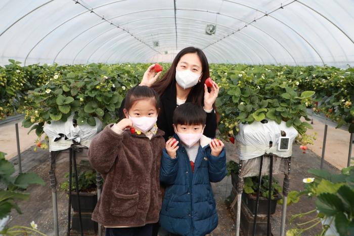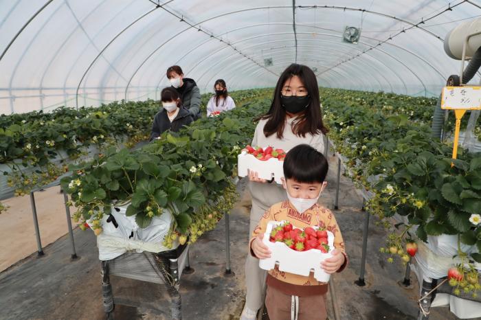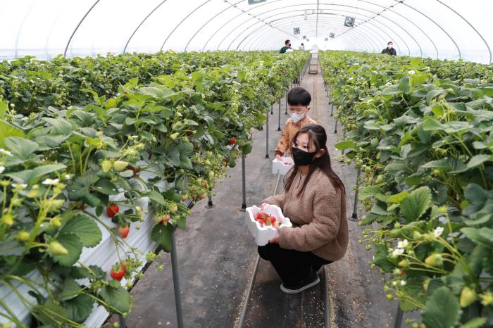 안동시 남후면의 한 딸기 농원에서 가족 나들이객들이 새콤달콤한 설향 딸기를 수확하고 있다. 호기심으로 가득한 어린이들이 딸기 따는 체험을 하면 즐거운 시간을 보내고 있다. 딸기 체험은 1월부터 5월까지 이어진다.