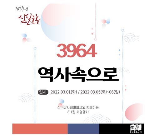 다가오는 삼일절을 맞이하여 삼국유사테마파크에서는 3.1절의 의미를 되새기기 위한 ❬3964 역사속으로❭행사를 진행한다.