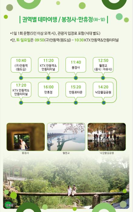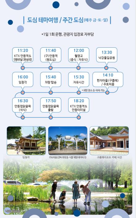 | [10:30](구)안동역(원도심) - [11:20] 안동역 – 봉정사 – 월영교(중식) - 낙강물길공원 – 안동포타운 - 만휴정 - [17:20] 안동역