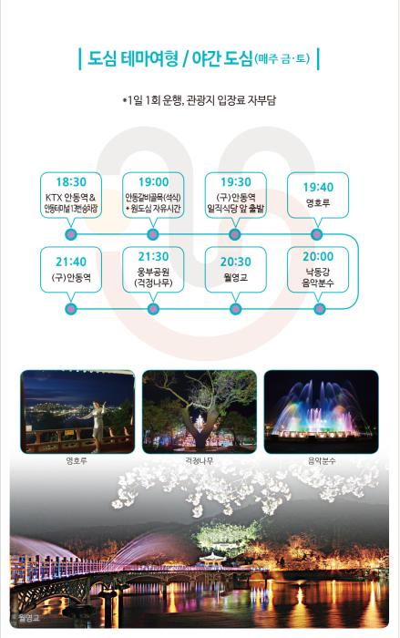| [18:30] 안동역 – 안동찜닭골목(석식) – 영호루 – 낙동강음악분수 – 월영교 – 웅부공원 - [21:30] (구)안동역
