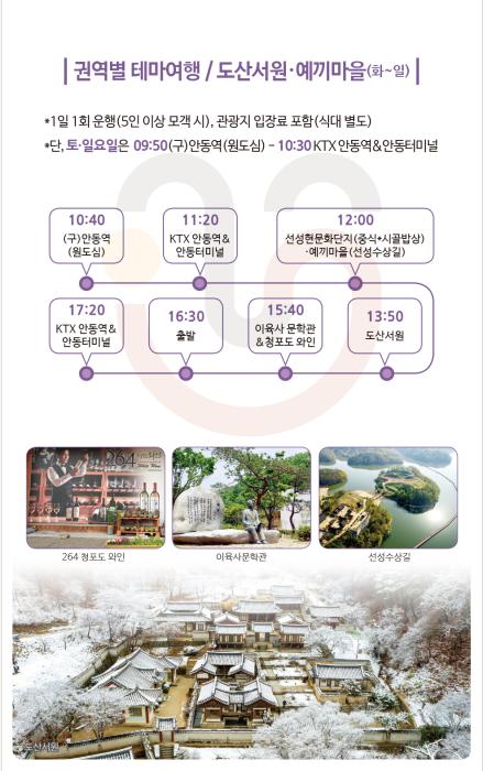 | [10:30](구)안동역(원도심) - [11:20] 안동역 – 선성현문화단지(중식)·예끼마을 - 도산서원 – 이육사문학관 – 이육사청포도와인(시음) - [17:20] 안동역