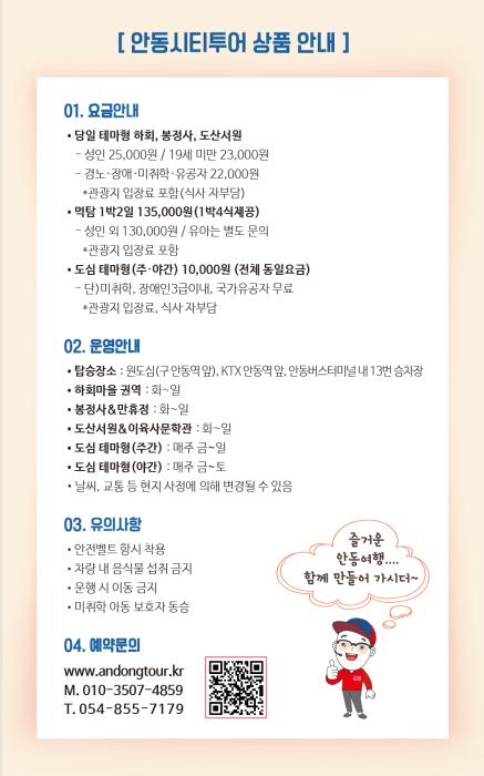 안동시티투어는 ▲주간 도심 테마(10,000원, 매주 금, 토, 일 상시 운영), ▲야간 도심 테마(10,000원, 매주 금, 토 상시 운영), ▲하회마을 테마(25,000원, 매주 화 ~ 일 운영), ▲도산서원&예끼마을 테마(25,000원, 매주 화 ~ 일 운영), ▲봉정사&만휴정 테마(25,000원, 매주 화 ~ 일 운영), ▲1박2일 테마(135,000원, 매주 화 ~ 일 운영) 투어 상품이 있다. 자세한 운행 정보 및 예약신청은 안동시티투어 홈페이지(www.gbtour.kr)를 통해 확인하거나 054-855-7179로 문의하면 된다.