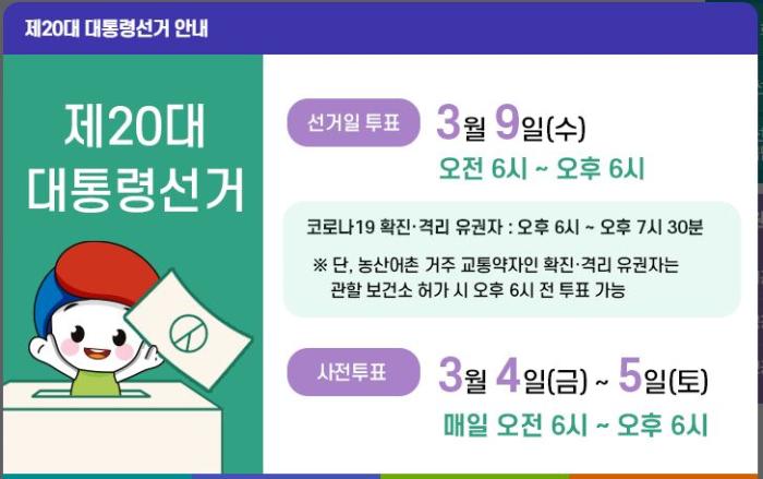 선거투표일 : 3.9.(수) 06:00~18:00 ※ 코로나확진·격리자 : 18:00~19:30