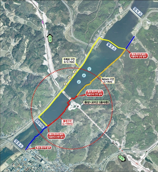 기존과 같이 통행제한 구간은 안동댐지정지에서 용상~교리2 국도대체우회도로 공사구간 중 용상대교 건설을 위해 설치된 가교까지 700m정도이다.