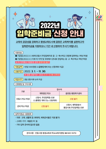시 관계자는 “이번 입학준비금 지원을 통해 코로나19로 어려움을 겪는 안동 시민에게 조금이나마 도움이 되길 바라며, 대상 학생들이 신청 시기를 놓치는 일이 없도록 적극적으로 홍보할 계획이다.”라고 말했다.(업무부서/학교교육지원팀 054-840-5562)