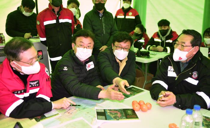 주호영 전 국민의힘 원내대표 산불현장지휘소 방문(산림청장, 울진군수, 박형수 의원, 이철우 지사, 주호영 전 원내대표)(사진 위)