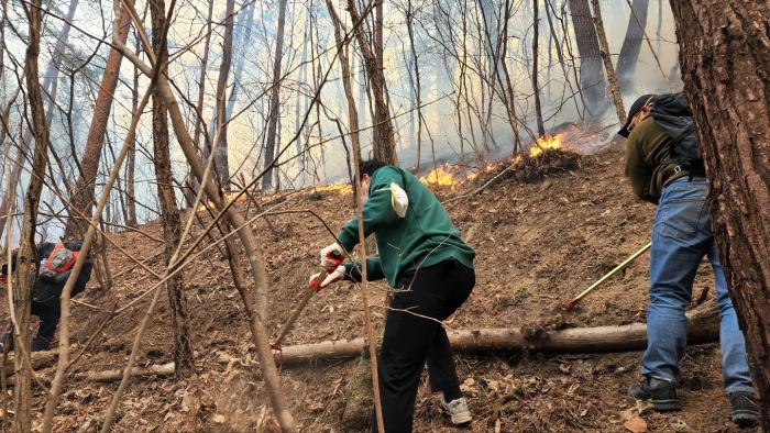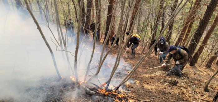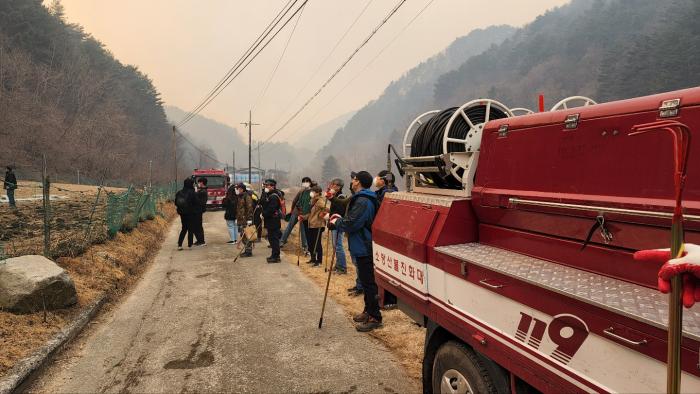 한국국학진흥원(원장 은 지난 8일 배성길 부원장을 단장으로 직원 22명이 울진군 산불현장 지원에 참여했다고 밝혔다. 직원들은 울진군 북면 두천리에서 짙은 연기로 인한 악조건 속에서 방화선을 구축하고 추가 확산을 차단하기 위해 잔불 정리 작업에 전력을 다했다.