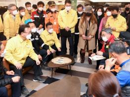 김부겸 국무총리는 3월 11일(금) 오후 울진․삼척․강릉․동해 산불 피해 현장을 방문하여 이재민들을 위로하고, 산불 진화에 힘쓴 특수진화대 등 관계자들을 격려하며, 신속한 피해 복구와 지원을 당부했다.