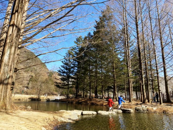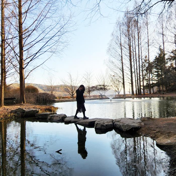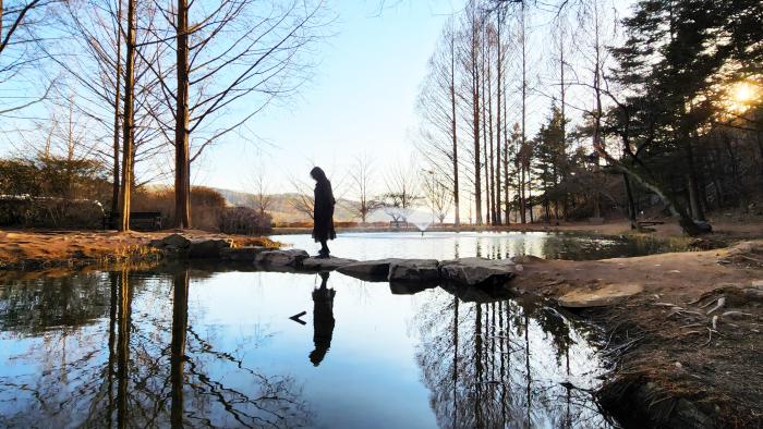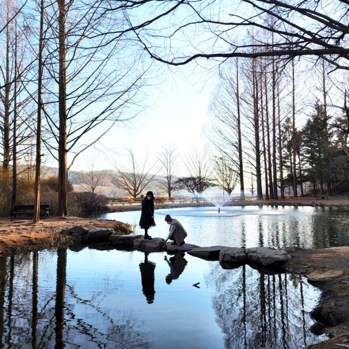 [화보] 새싹이 움트는 봄을 맞은 낙강물길공원에 나들이객들이 북적인다. 우뚝 선 메타세콰이어 나무를 배경으로 연못에 가로놓인 징검다리는 요즘 가장 인기 있는 포토스팟이다. (사진제공/안동시공보)