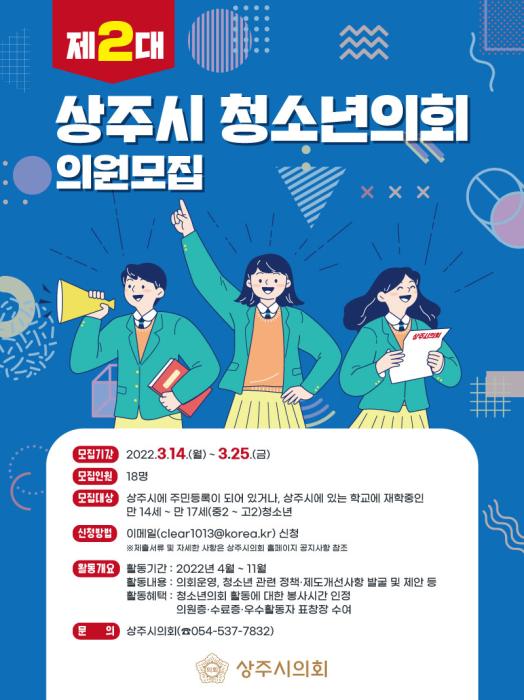 상주시의회는 청소년 관련 정책과 문제에 대하여 자유롭게 의견을 표현하고, 지방의회의 의정 활동과 정책결정 과정을 경험할 수 있는 기회를 제공하고자 「제2대 상주시 청소년 의회」 의원을 모집한다.