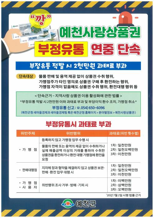 예천군 관계자는 “예천사랑상품권 발행 확대로 부정유통 가능성이 제기됨에 따라 일제단속을 실시해 올바른 유통질서를 확립하고 지역경제 활성화에 도움이 될 수 있도록 최선을 다 하겠다.”고 말했다.(업무부서/새마을경제팀 054-650-6096)