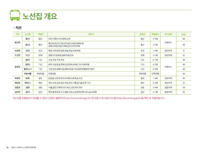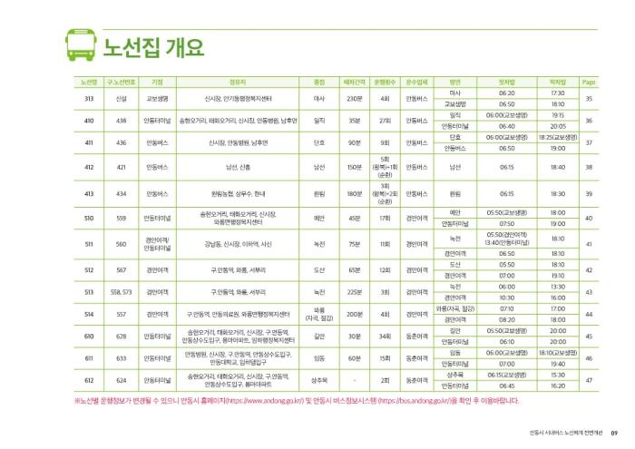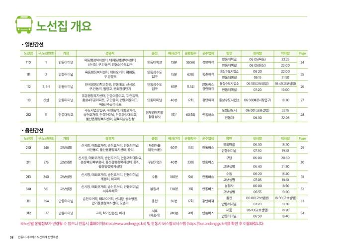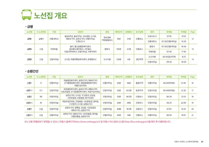 자세한 시간표와 노선도는 안동시청 홈페이지(www.andong.go.kr) 및 안동시 버스정보시스템(bus.andong.go.kr) 홈페이지에서 확인이 가능하다.