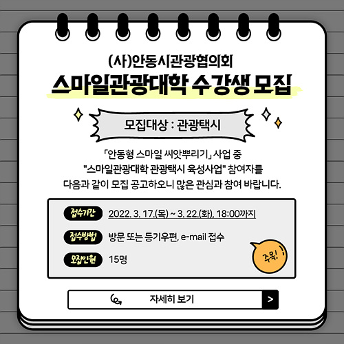 접수기간은 3월 17일 ~ 22일 오후 6시까지이며, 교육을 희망하는 자는 안동시관광협의회 홈페이지, 안동시 홈페이지 유관기관소식에 게재된 신청서를 작성하여 안동시관광협의회로 방문 또는 이메일(ata0515@naver.com)로 제출하면 된다.
