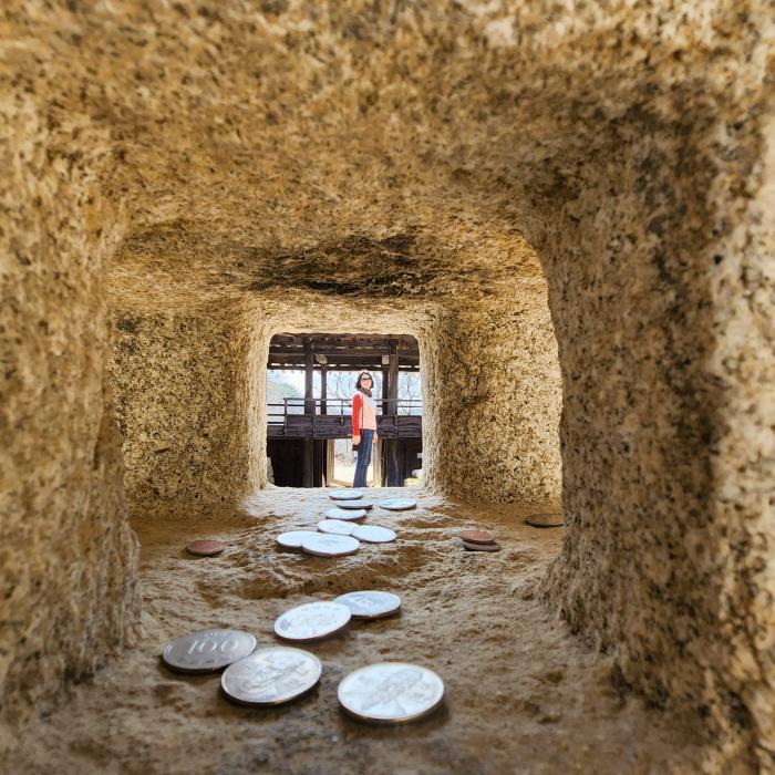 봉정사 찾은 관광객, 만세루 앞에서 포즈를 취한 관광객들이 석등 사이로 보인다.