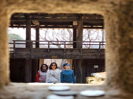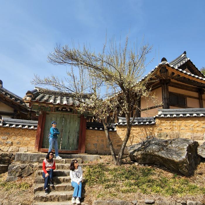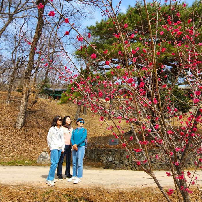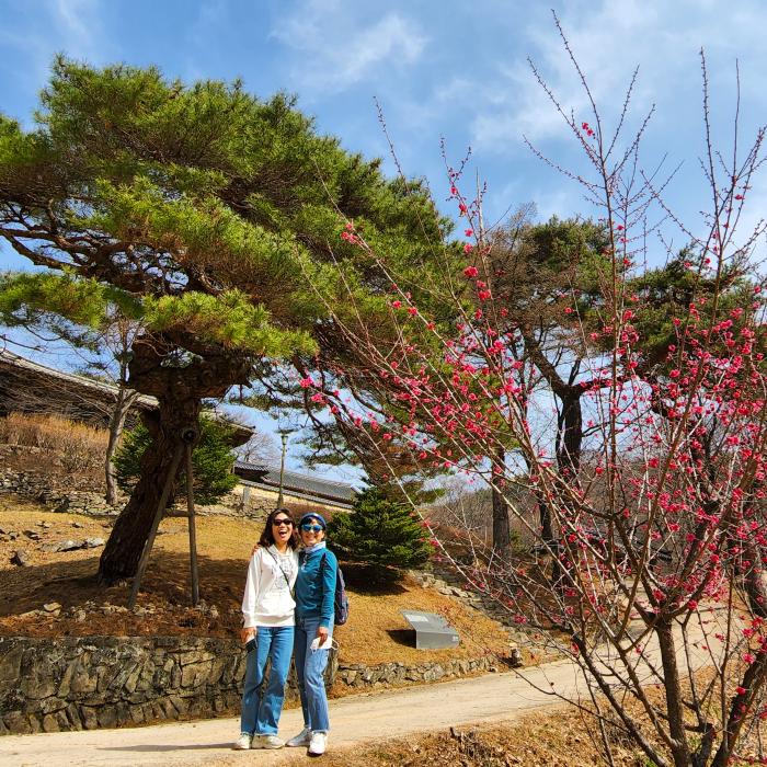 안동 봉정사를 찾은 관광객들이 봄의 정취를 만끽하며 즐거운 한 때를 보내고 있다. 만세루 앞마당에 홍매화가 만개하며 관광객들을 환영하는 듯하다.