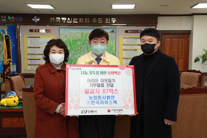 안동시 남후농공단지에 소재한 농업회사법인 ㈜한국라이스텍은 백미, 현미, 잡곡류 유통업체로서 어려운 이웃을 위해 꾸준히 백미와 쌀과자를 기부하며 나눔 실천에 솔선수범 참여하고 있다.