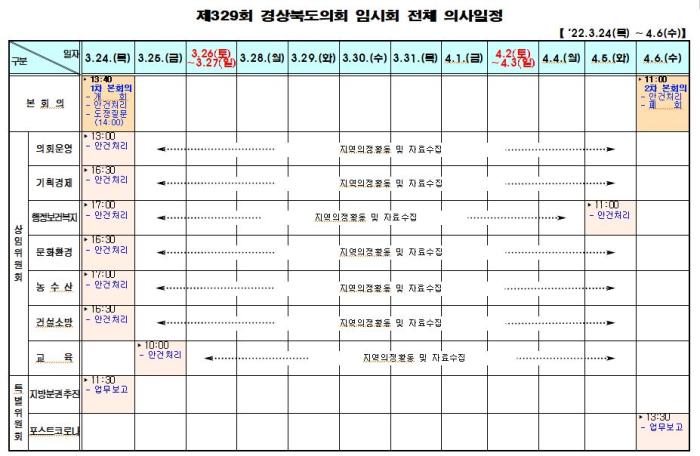 경상북도의회(의장 고우현) 제329회 임시회가 3월 24일부터 4월 6일까지 14일간의 일정으로 개회한다. 이번 임시회는 6월 지방선거를 앞둔 회기로 제11대 경상북도의회의 마지막 도정 질문과 함께 각종 민생 조례안 등을 처리할 예정이다.