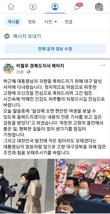 이 지사는 페이스북을 통해 “박근혜 대통령님의 귀향을 축하드리기 위해 대구 달성 사저에 다녀왔습니다. 정치적으로나 마음으로나 따뜻한 고향에 오신 것을 진심으로 축하드린다”며 “그간 힘든 시간 속에서 약해진 건강도 하루 빨리 되찾으시기를 진심으로 바란다”고 말했다.