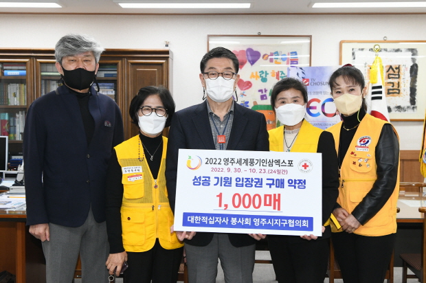영주세계풍기인삼엑스포조직위원회(위원장 이희범)는 지난 24일 영주시장실에서 대한적십자사 봉사회 영주시지구협의회(회장 신영희)와 입장권 구매 약정식을 개최했다.