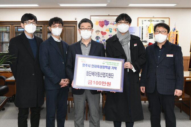 (재)영주시인재육성장학회는 25일 첨단베어링산업지원단(단장 박정락)에서 100만원의 장학금을 기탁했다고 전했다.