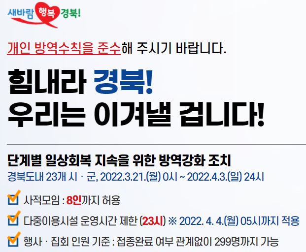 경상북도에서는 최근 1주일간 국내 10만4052명(해외유입 제외)이 발생해, 주간 일일평균 1만4864.6명이다.(업무부서/감염병관리과)